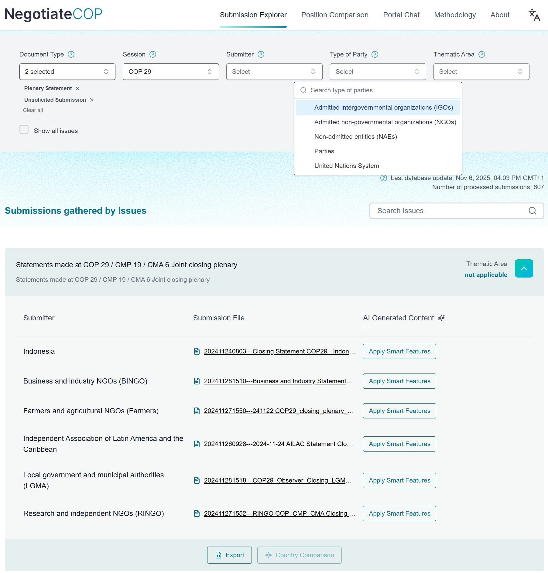 Submission Explorer: The Submission Explorer can be used to browse, search, and filter official submissions for COP29, COP30 and their subsidiary bodies by document type, session, submitter, type of party or thematic area. The submissions are organized in so-called “issues” linked to the thematic areas. Within a thematic area, many issues could be present, whereby each of them comes with corresponding party submitter uploads listed below the issue. The list of all found documents is shown and can be exported as table.