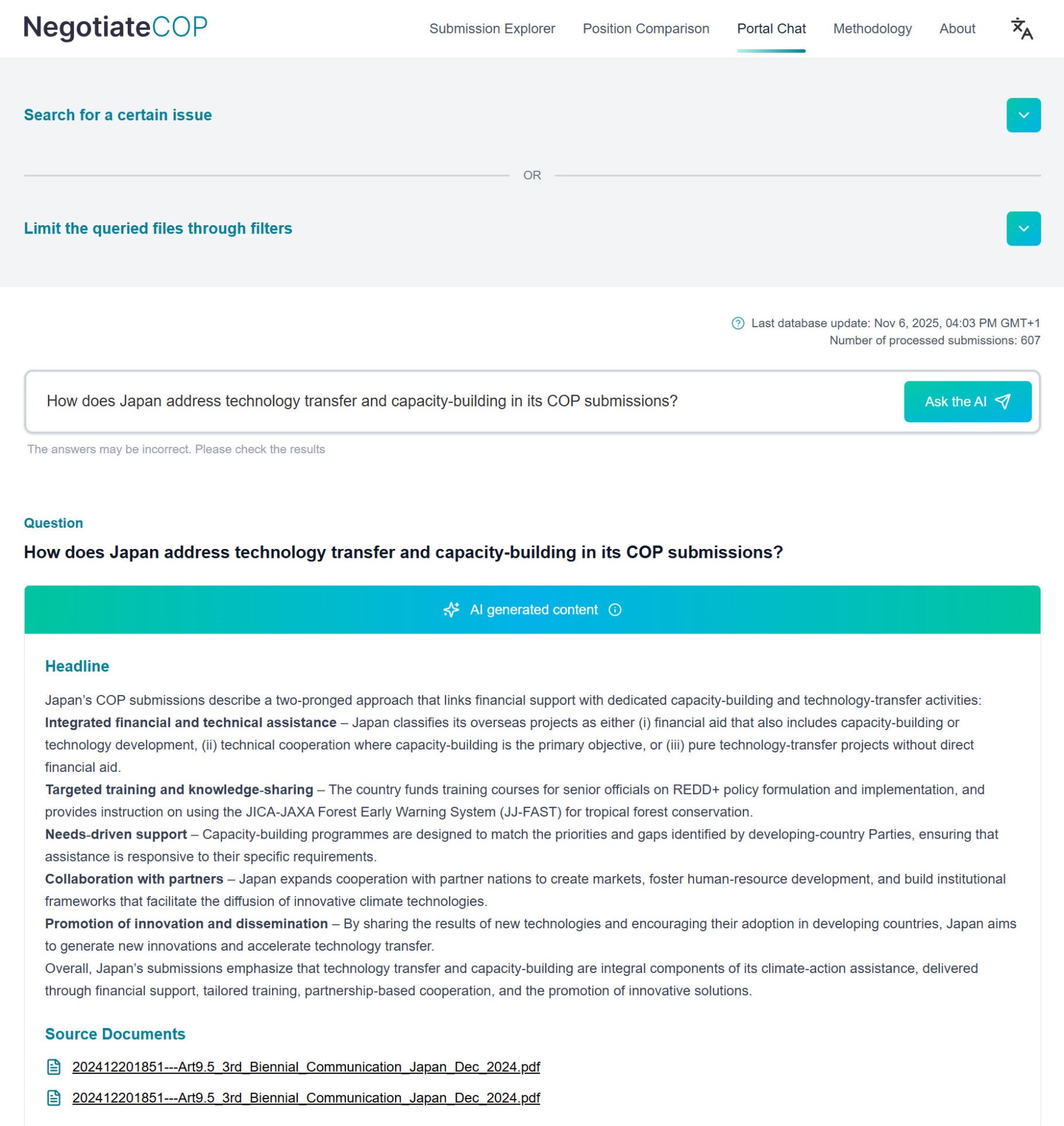 Right on time for the 30th annual Climate Conference (COP30) in Belém, we launched our new tool “NegotiateCOP” that assists delegates navigate the extensive volume of documents submitted to the UNFCCC submission portal by more than 190 attending countries. The large language model (LLM)-based tool entails three main features: Submission Explorer, Position Comparison and Portal Chat, all designed to assist with the labour-intensive preparations for complex negotiations. Especially small or under-resourced delegations without the support of large back offices can profit from the quick access and tangible overview NegotiateCOP provides.
